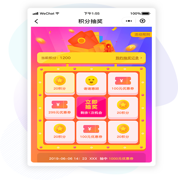 积分激活二次营销设置抽奖消耗积分,可抽取积分及优惠券,刺激用户多次消费。