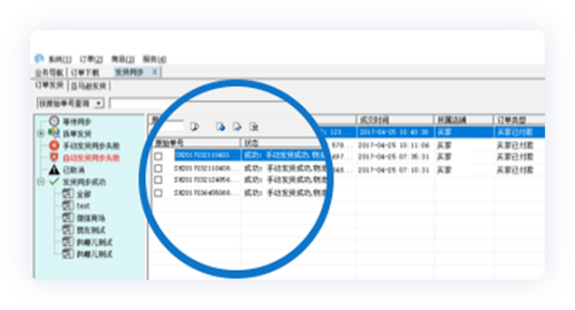 网店管家软件可同步哟店发货订单的原始单号、成交时间、订单类型、发货时间、收件人、发货单号及发货方式